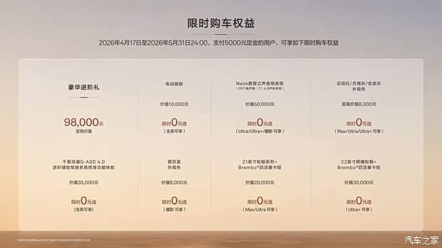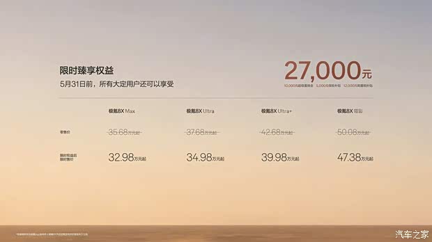 半岛体育,半岛体育官方网站,半岛体育APP下载[汽车之家 资讯] 4月17日,极氪8X正式上市,新车共推出4款车型,售价35.68-50.08万元,5月31日前大定可享上市限时权益价32.98-47.38万元。购车权益方面,5月31日24点前支付5000元定金,新车限时可享至高9.8万元的豪华进阶礼,包括电动踏板、Naim殿堂之声音响系统、月海灰等外观色、千里浩瀚G-ASD 4.0终身体验、21英寸轮圈+Brembo四活塞卡钳等,分不同车型权益不同,均可限时免费配备,详见下图。极氪8X基于浩瀚-S超级电混架构打造,采用900V高压架构,定位中大型插混SUV,CLTC最大纯电续航410km,新车推出Max、Ultra、Ultra+、曜影四款配置车型,在动力、智能化等核心维度形成清晰梯度。极氪8X的配置应该如何选?本文将以图片形式直观展现所有车型的配置梯度,哪款车型值得选,我们也给了建议。