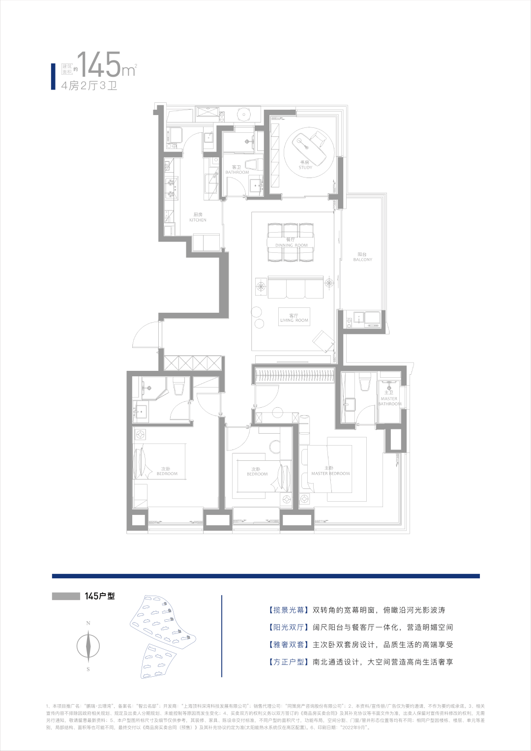建面约145㎡4房,拥有大横厅搭配270°景观视野,套数不多,改善置业必抢!