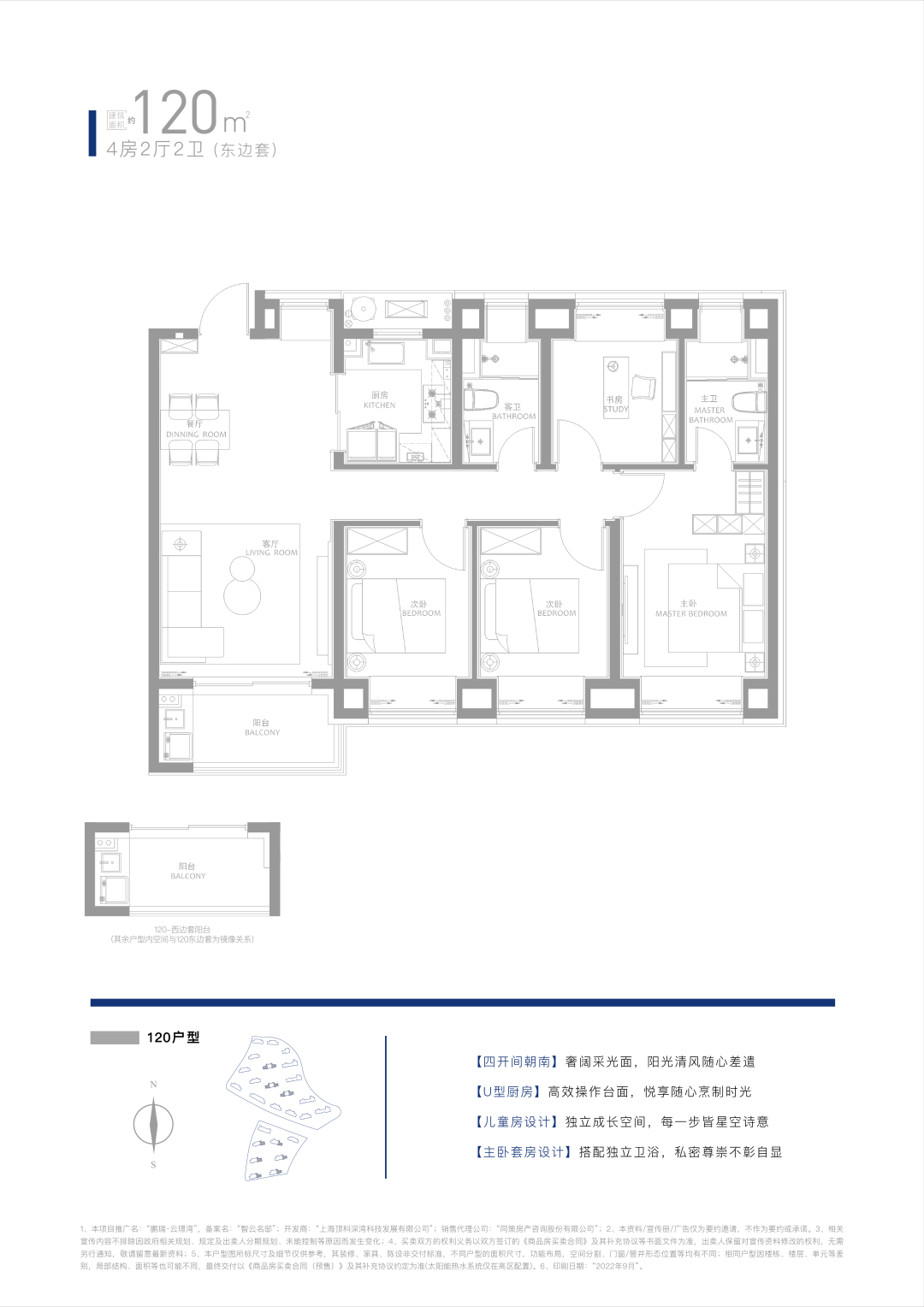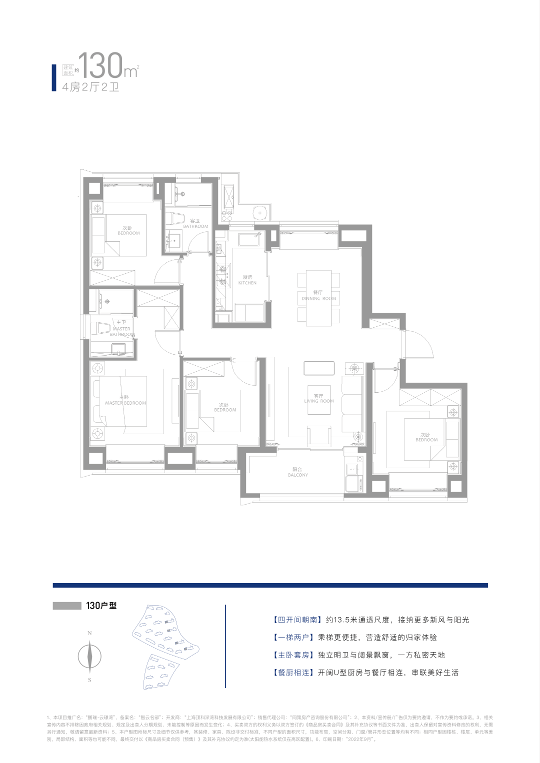 120-130㎡ 4房2厅2卫(四开间朝南,客餐南北通透),总价约410万起