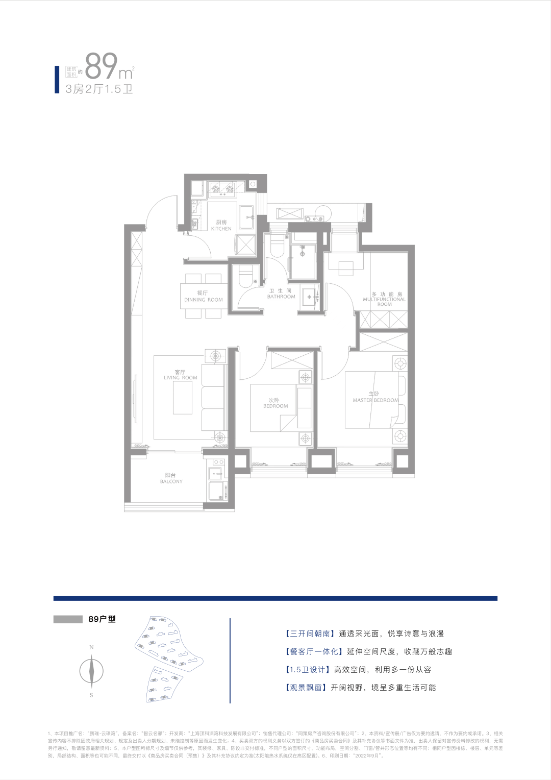 89㎡ 3房2厅1.5卫(临港首创1.5卫设计,解决如厕拥挤问题),总价约285万起