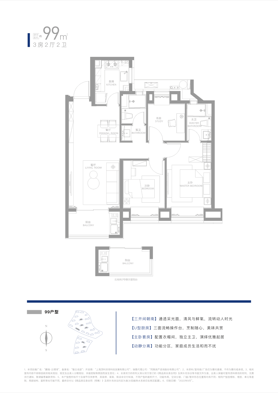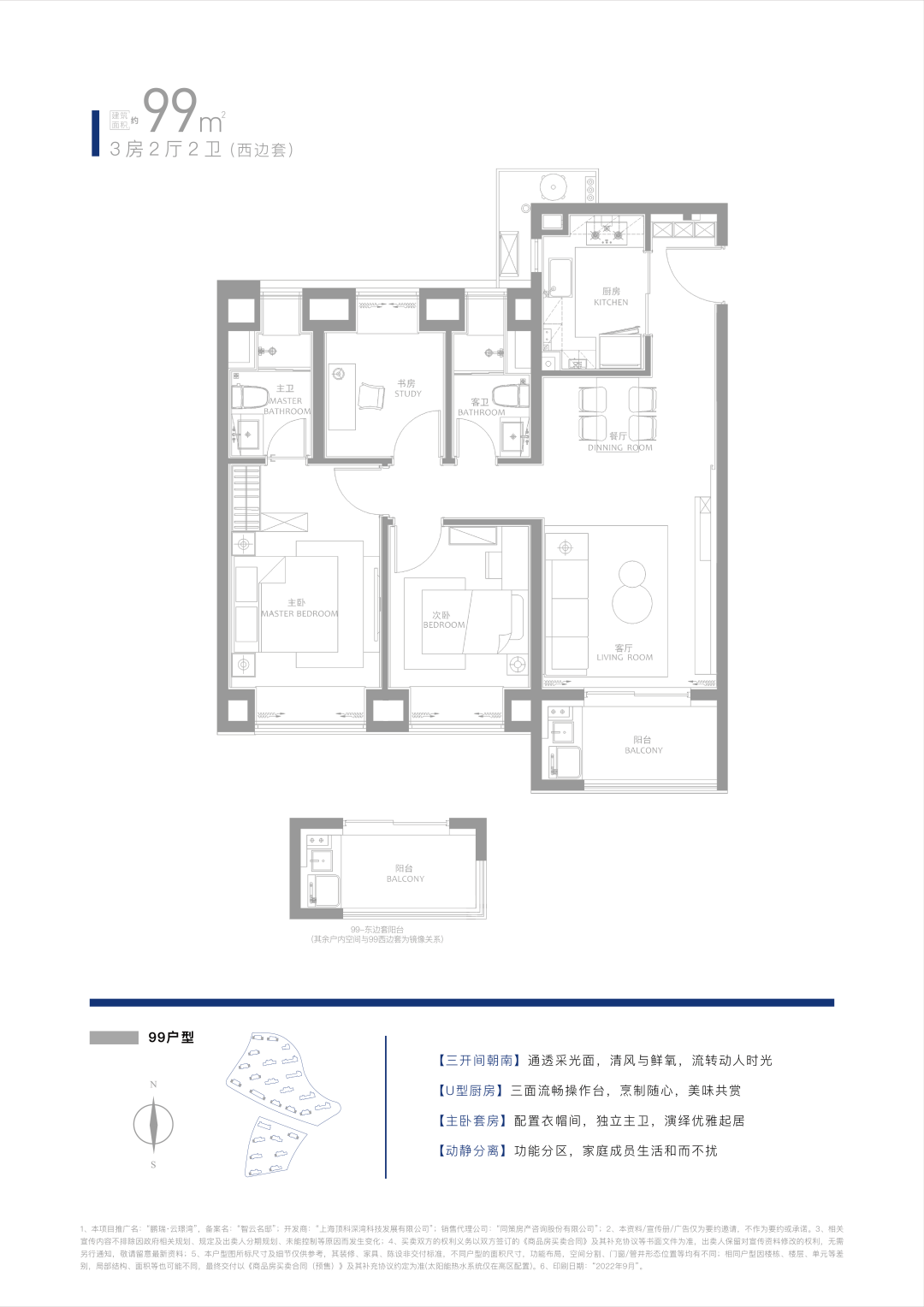 99㎡ 3房2厅2卫(三开间朝南+全卧飘窗,得房率约78%),总价约370万起