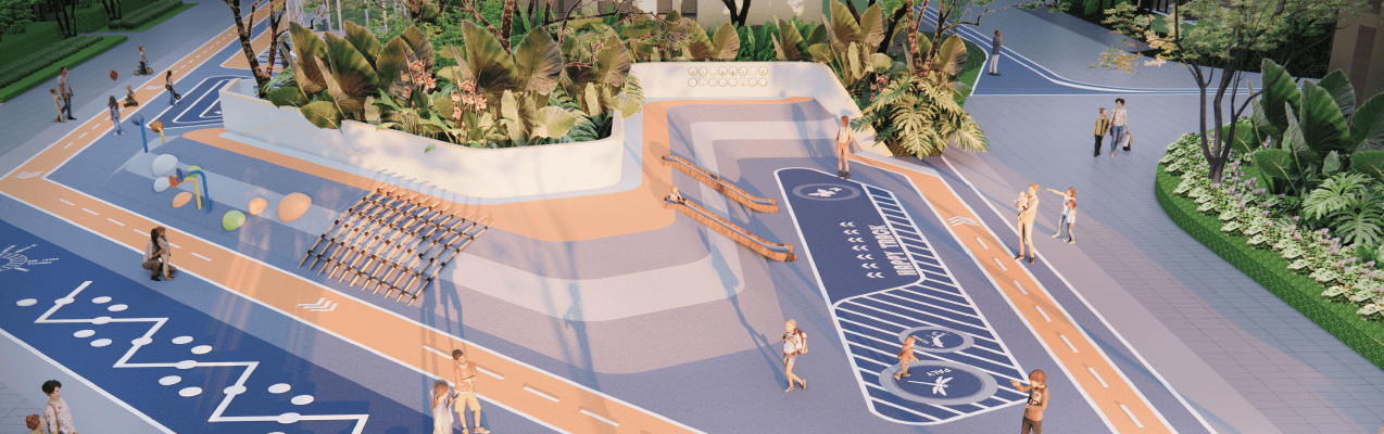 儿童专属:学步区+攀爬区+音乐跑道,配备银杏、碧桃等无毒植物,地面采用彩色塑胶铺装,搭配绣球花、大叶黄杨,兼具安全性与趣味性。