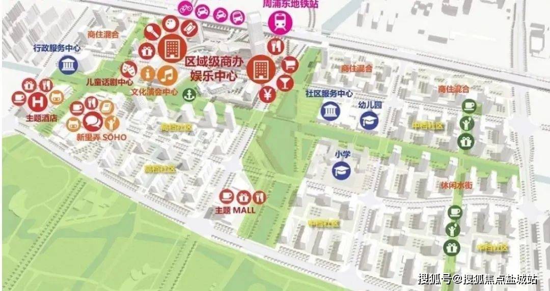 ,几乎规划了日常生活的所有配套设施,规划图显示,核心区将会形成三轨交站点加有轨电车交通布局。轨交站点包括16号线周浦东站
